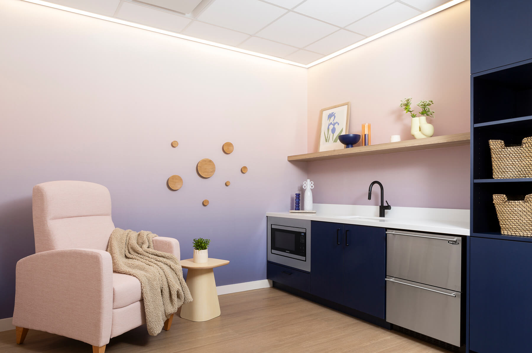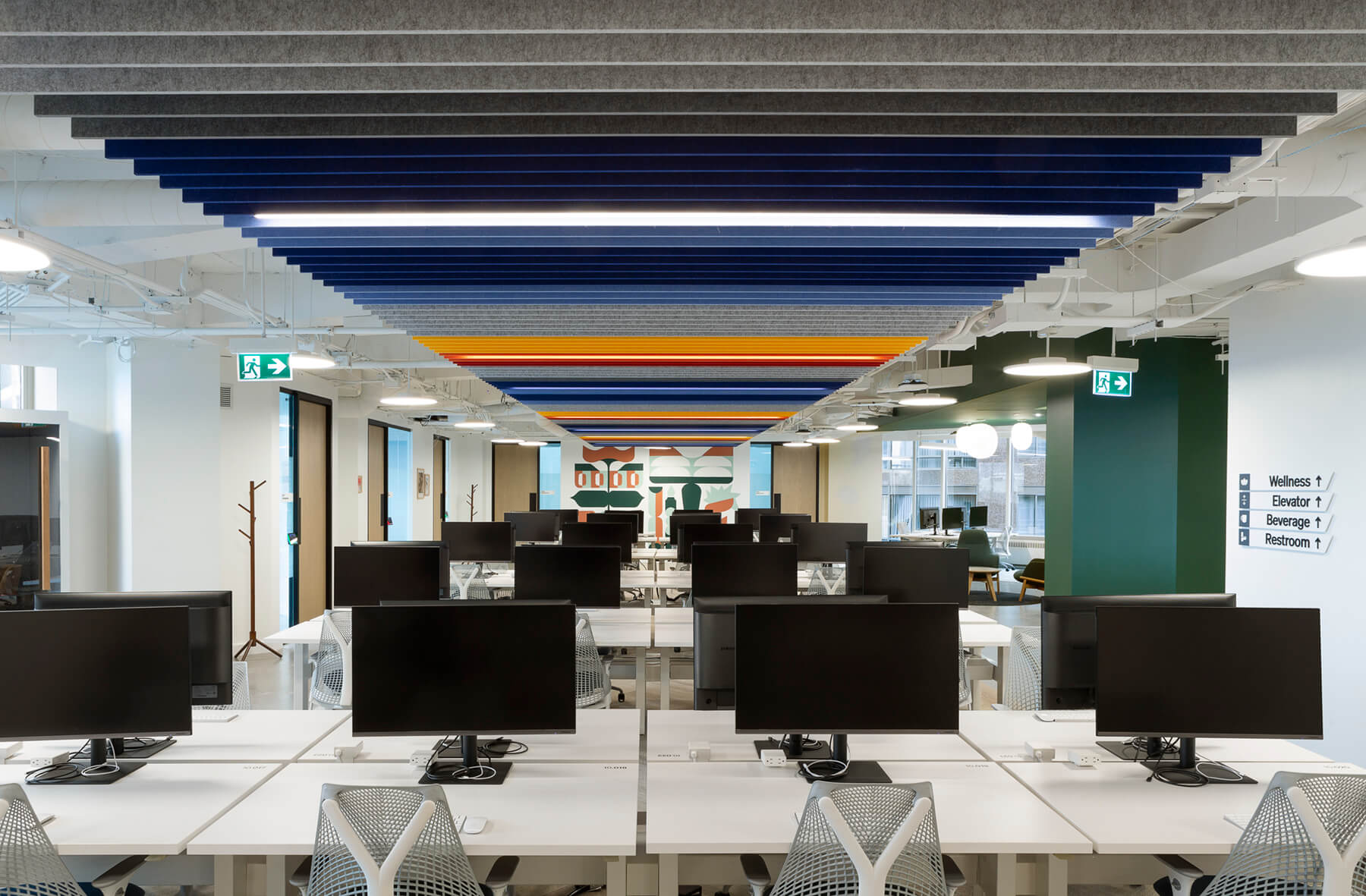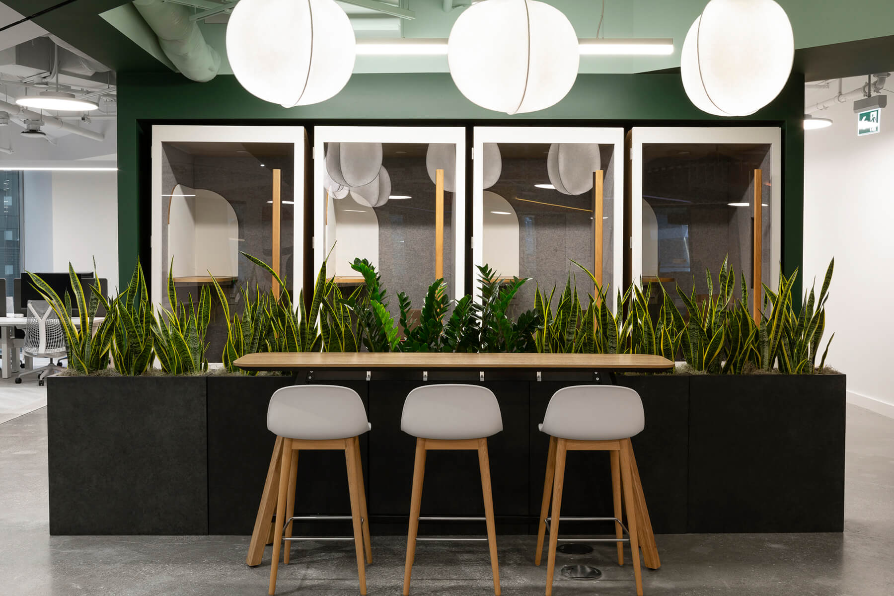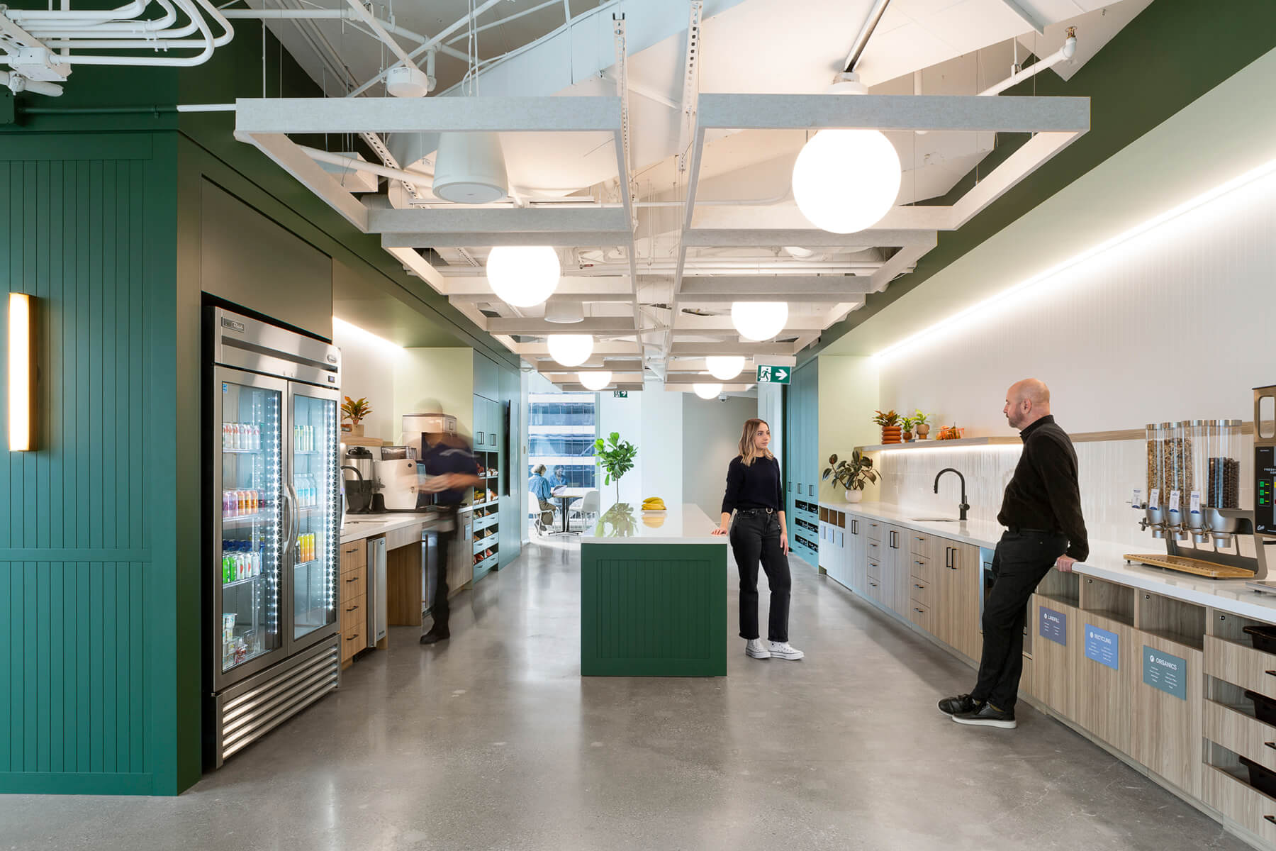 An upgraded lighting package, acoustic wall panels, and ceiling baffles were installed to enhance focus, privacy, and overall workplace acoustics. Extensive custom millwork was incorporated throughout collaboration spaces and amenity areas, reinforcing both functionality and design consistency.